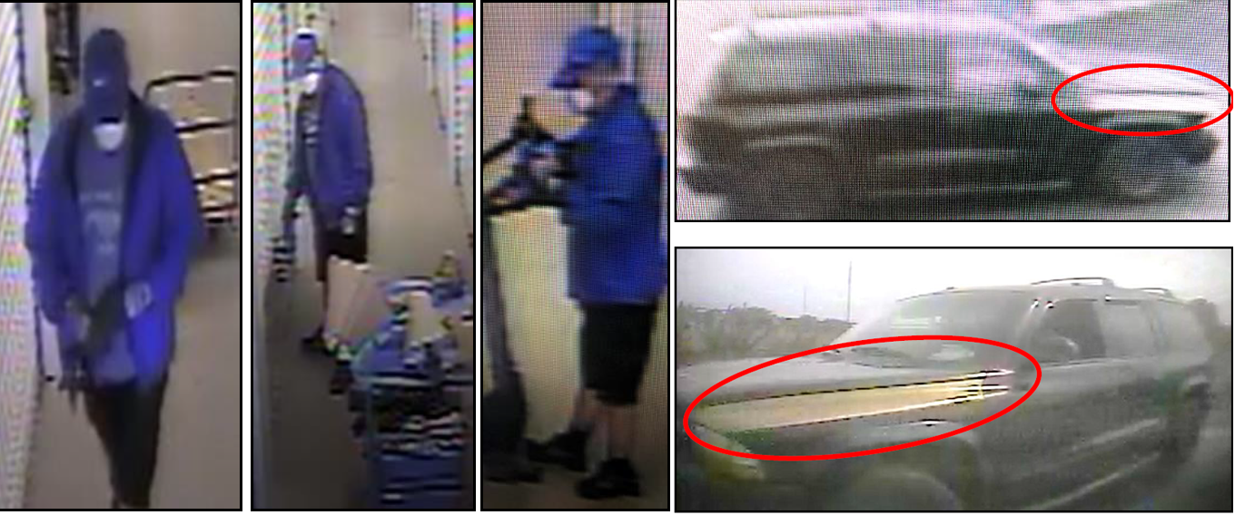 The suspect (seen wearing the blue jacket) drove onto the gated property in an older dark-colored Dodge Durango with gold or yellow accents on opposite sides of the hood.