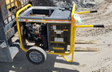 The generator is a Wacker brand, model #GPS9700V. It has a yellow frame, and black body.